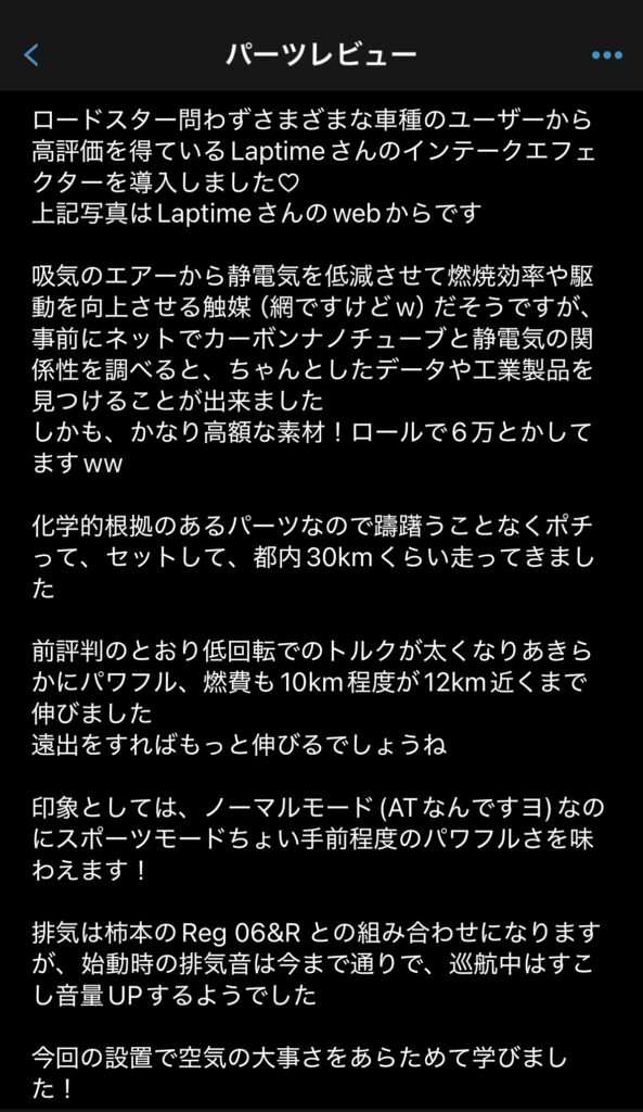 ロードスター問わずさまざまな車種のユーザーから高評価を得ているLaptimeさんのインテークエフェクターを導入しました♡